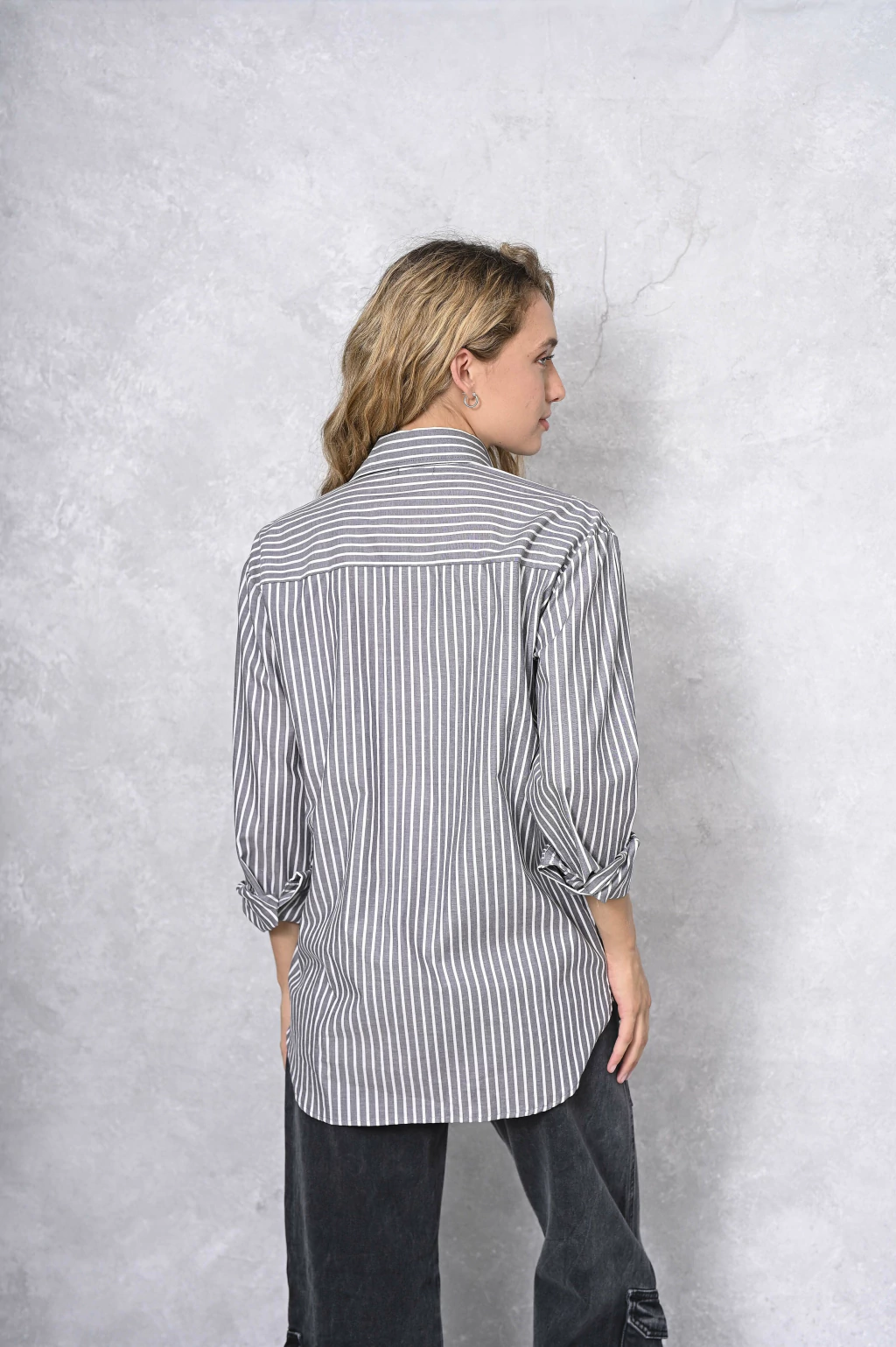 Camisa oversize confeccionada en poplin rayado 100% algodón. Cartera escondida. Prenda cómoda y canchera para combinar con dénim, cuero o un pantalón sastrero.